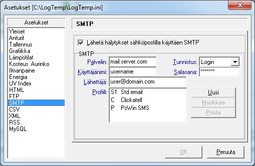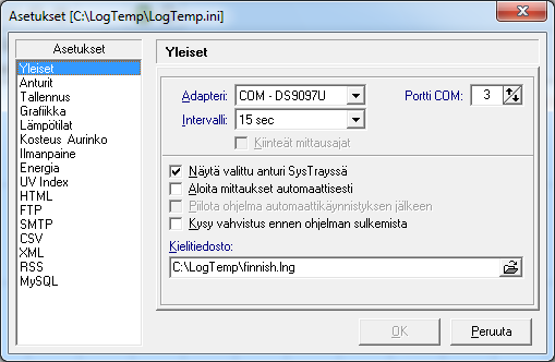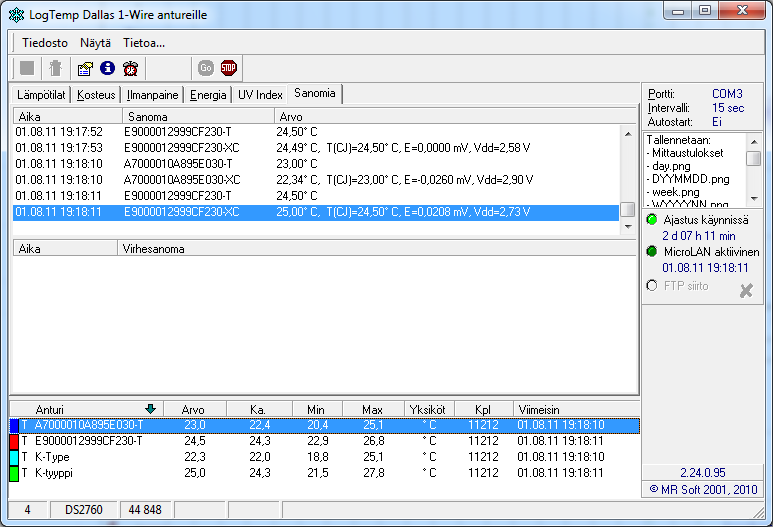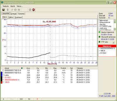 Ohjelmalla voidaan seurata ja tallentaa useiden 1-wire antureiden